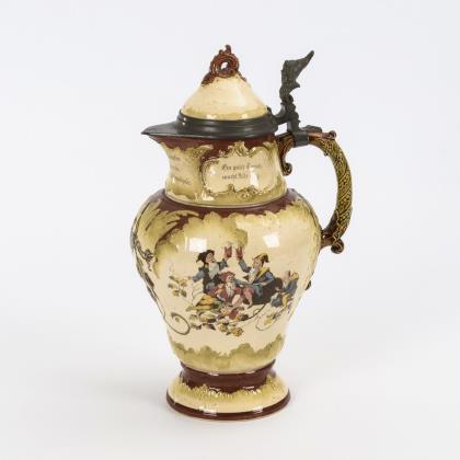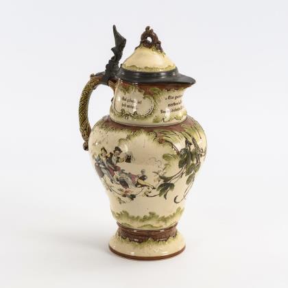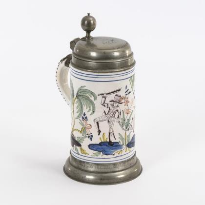 Zylinderform mit Bandhenkel. Schauseitig ein springender Hirsch und ein Jagdhund, flankiert von Palmbäumen. Profilierter Zinndeckel mit Reliefplakette und Kugeldrücker, Zinnstandring