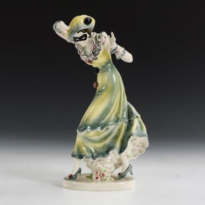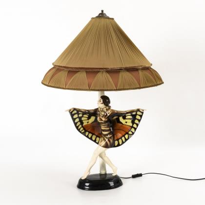 Fayence-Plastik mit Darstellung eines faunalen Ausdruckstanzes nach dem berühmten Vorbild der deutschen Tänzerin Niddy Impekoven, auf schwarzem Ovalsockel. Wohl originaler Schirm mit brauner Stoffbespannung. Neu elektrifiziert