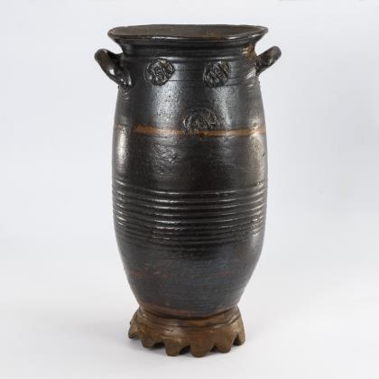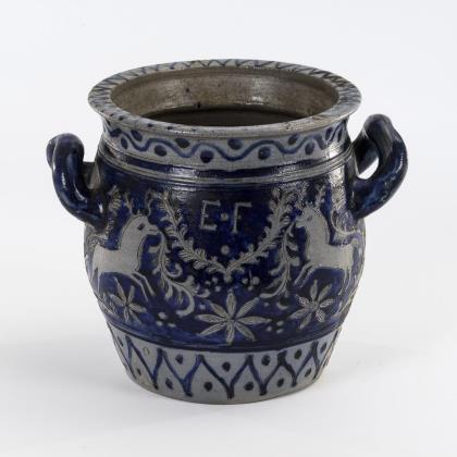 Zylindrisches Bodengefäß mit 2 Henkeln und Wellenfuß, Wandung mit Rillenzier und runden Auflagen mit Monogramm "CGK"