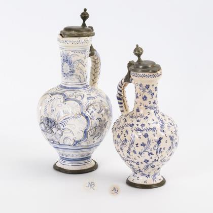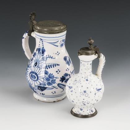 Birnkrug mit Blumen (Ende 18. Jh., H 17,5 cm). Kugelbauchkrug mit Enghals und Vögelesdekor (20. Jh., H 16 cm). Beide mit Zinnmontierung