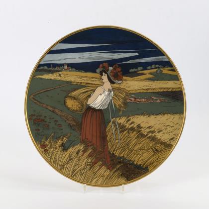 Jugendstil-Dame mit einem Ährenbündel in einer Landschaft zur Getreideernte