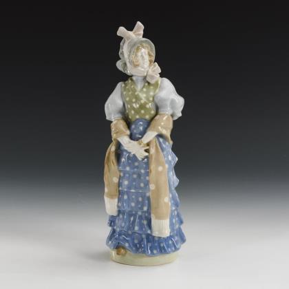 "Dame (Mädchen) mit einem Blumenstrauß" (H 13,5 cm). Grüßender "Herr (Knabe) im Mantel" (H 14 cm)