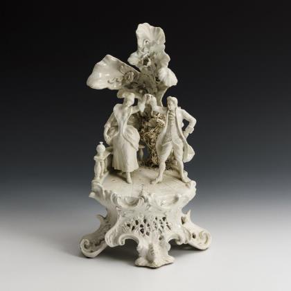 Tanzendes Rokoko-Paar auf durchbrochenem Rocaille-Sockel mit Balustrade und großer Pflanze