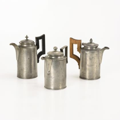 Ungemarkte Kanne mit Scharnierdeckel und Holzgriff. Kanne mit schwarzem Holzgriff "F. Fleegel Wolfenbüttel" gemarkt; auf der Wandung Gravur "HB 1877". Kanne mit Zinngriff "G.A. Venus in Grimma" gemarkt; auf der Wandung Gravur "RMW 1844"