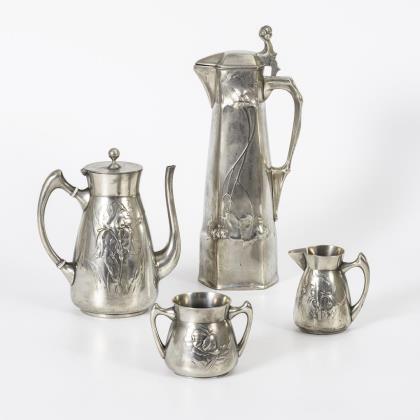 Schlanke Kanne, Teekanne, Sahnegießer und Zuckerschale; je mit vegetabilem Relief