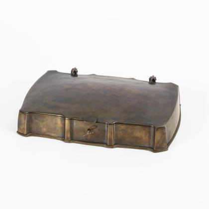 Quaderförmiges "Minnekästchen" auf gedrückten Kugelfüßen; auf dem Scharnierdeckel ein klappbarer Baluster-Tragegriff über dem Schlüsselloch. Allseits und auf dem Deckel Scheinkassetten mit flächenfüllendem, vegetabilen Ätzornament. Im Deckel Schloss mit Sonnenscheiben-Kapelle, 2 Herzschilden und 2 Zuhaltungen über den Resten eines Ätzornamentes
