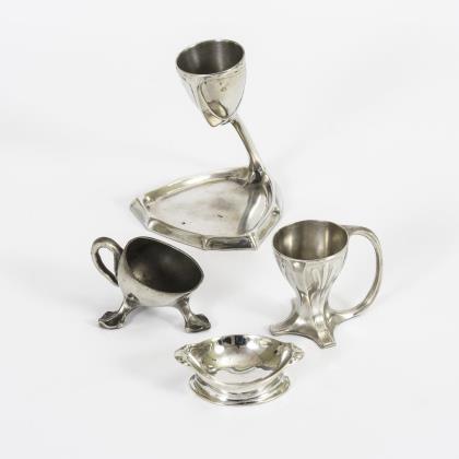 Konvolut Jugendstil-Zinn: 3 Eierbecher und 1 Saliere