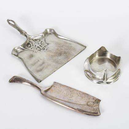 Konvolut Jugendstil-Silberzinn: 2 Tischschaufeln und 1 Flaschenhalter