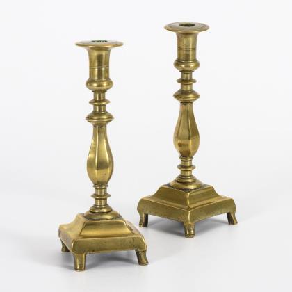 Massive Bronzeleuchter mit dezenter Gravur auf dem Quadratfuß sowie Baluster und schlanke Vasentülle