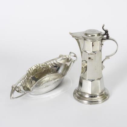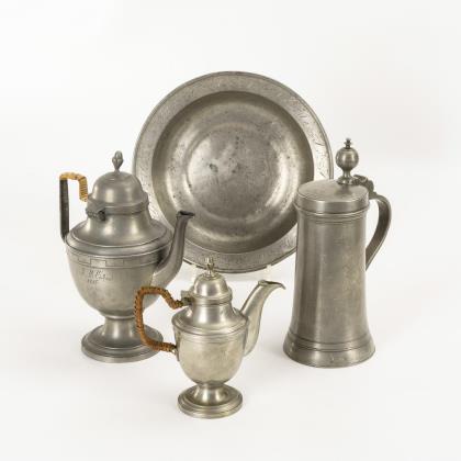 Tiefe Schüssel mit geflechelter Gravur auf der Fahne; undeutlich Christian Friedrich Hösel in Plauen gepunzt. / Konischer Vogtländer Krug mit Eichzapfen innen und Gravur "JBH 1821" auf dem Deckel; Johann Martin Elias Möller in Schneeberg gepunzt. / Vasenförmige Kanne mit graviertem Fries und Gravur "JM Erfurt 1816". / Kleine gleiche Vasen-Kanne mit gleichem Fries, jedoch Gravur "K"; beide Johann Friedrich Blumentritt in Neustadt/Orla gepunzt