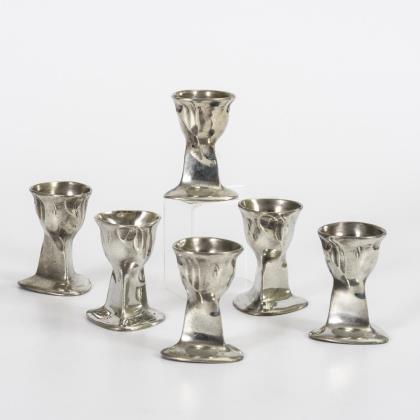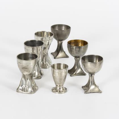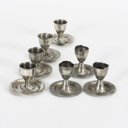 Hoher Urania-Eierbecher mit Fußschale, Eierbecher mit Henkel bzw. mit Blattfüßen und -Henkel sowie Kayserzinn-Saliere