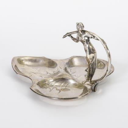 Versilberte Jugendstil-Dreipassschale mit Frauenplastik