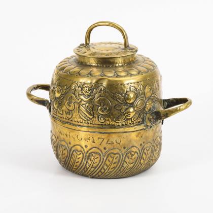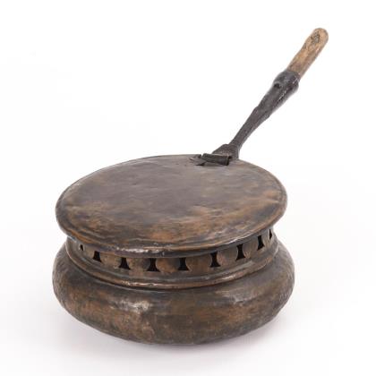 Aus einem dickwandigen Stück getriebener Bettwärmer mit Á-Jour-Scheibenfries und Scharnierdeckel; jeweils mit gebördeltem Rand. Angenietete Eisenhalterung mit Holzgriff