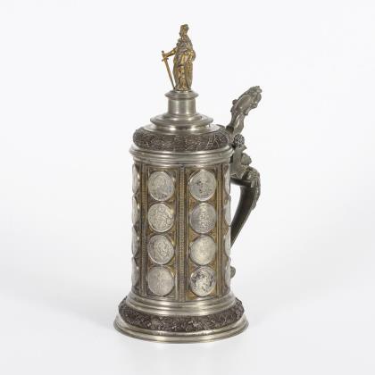 Humpen mit 24 Münzabgüssen bis 1871 (u.a. König von Preussen, Württemberg, Bayern usw.), Kriegerherme als Henkel, Drücker mit leerer Kartusche sowie allegorische Frauenfigur als Bekrönung auf dem Deckel