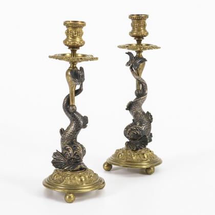 Bronzeleuchter mit reliefiertem Rundfuß, Delfin in barocker Manier als Schaft und Vasentülle über Tropfschale mit Blattkranz
