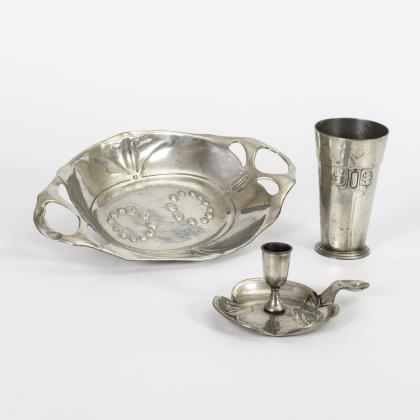 3x Jugendstil-Silberzinn: Schale, Becher und Kerzenleuchter