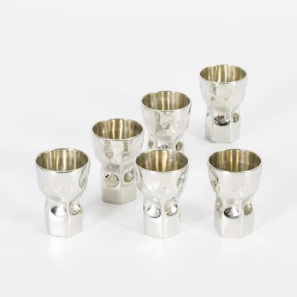 Versilberte niedrige WMF-Becher. Einzelner Juventa-Becher mit Peitschenschwüngen. Becher mit Quadrat-Fußschale und Modell-Nr. Vier gleiche Becher, davon 2 mit undeutlicher Monogramm-Gravur