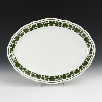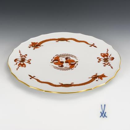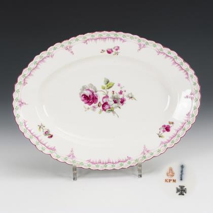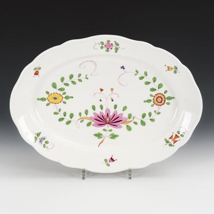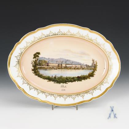 Ovale Platte mit passig geschweiftem Rand. Im Spiegel die bezeichnete Ansicht des Schlosses Pillnitz von 1754