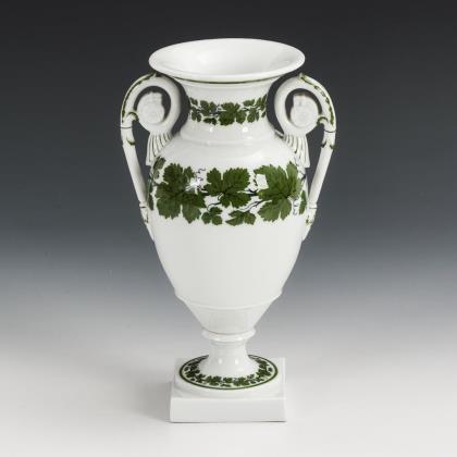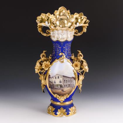 Schlanke Vase mit plastisch gestalteten Floralhenkeln und floralem Mündungsrand. Beidseitig eine große Ovalkartusche mit fein gemalten Architekturansichten: 1x die Ansicht eines Wohnhauses und 1x die Ansicht von Fabrikgebäuden. Verso bezeichnet "2ten Jan 1816." und "Das Alte ist vergangen, siehe, es ist Alles neu geworden. 2. Chor. 5 v. 17."
