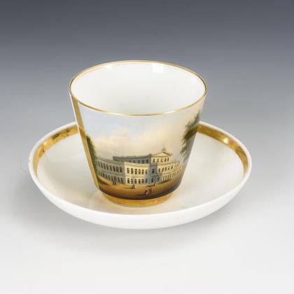 1x KPM Berlin, 1837-1844: Kratertasse (H 11 cm) mit Schlangenhenkel und originaler Untertasse (Ø 16 cm); schauseitig auf der Tasse die polychrom gemalte Ansicht des traditionsreichen Juweliergeschäftes Wilm in Hamburg. / 1x Meissen, um 1860-1918: in einen goldfarbenen Holzrahmen gefasstes Stück einer Platte mit Kobaltfond sowie einer Vierpasskartusche mit der Ansicht der Albrechtsburg in Meissen