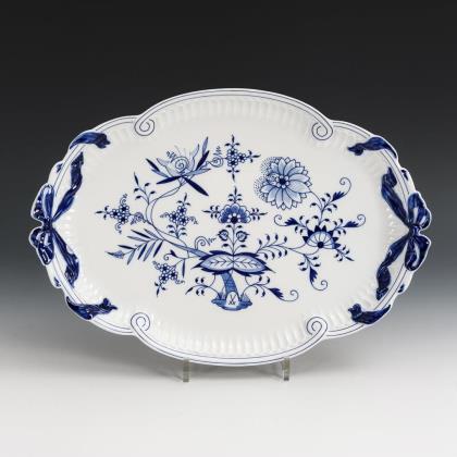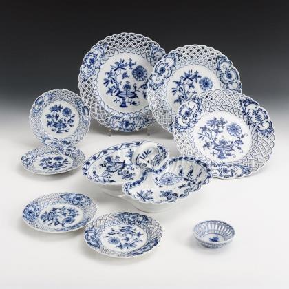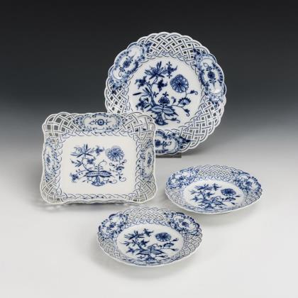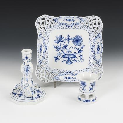 Zwiebelmuster-Durchbruchschale, -Kerzenleuchter und -Vase