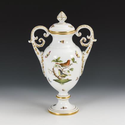 Gefußte Balustervase mit zwei Akanthusblatthenkeln und Knaufdeckel. Beidseitig Vogel- und Insektenmalerei