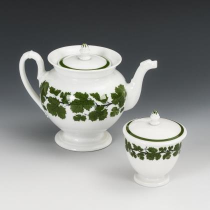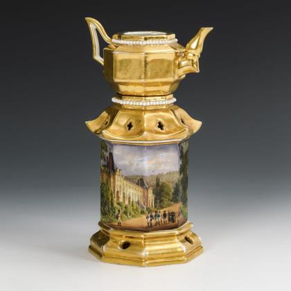 3-teilig. Oktogonale Form. Kännchen mit Goldfond und Perlband. In Form einer Pagode gestaltetes Stövchen mit bezeichneten Ansichten (Schloss Malmaison, Haverton)