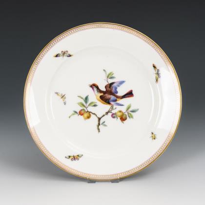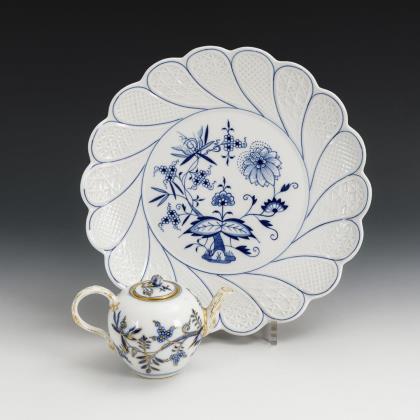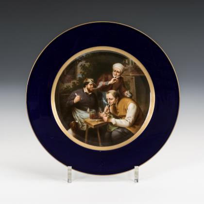 Teller mit Kobaltfahne und reicher, ornamentaler Goldmalerei. Im Spiegel die Ansicht einer Seelandschaft mit Insel, wohl der italienische Lago d'Orta mit Blick auf die Insel San Giulio. Der Teller war ursprünglich Teil eines Tafelaufsatzes, der Fuß aus Elfenbein ist ergänzt