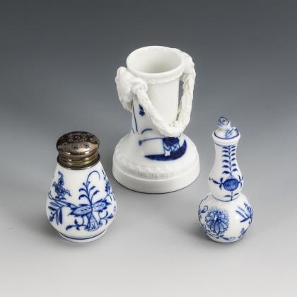Flakon, Salzstreuer und Vase mit Blaumalerei