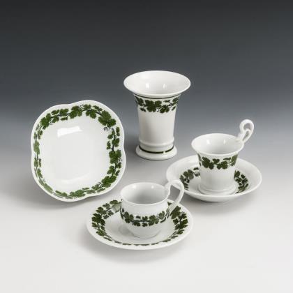 Form "Neuer Ausschnitt". 7 Kaffeetassen (H 6,5 cm), 7 Untertassen (Ø 14 cm) und 1 Vase (H 11 cm)