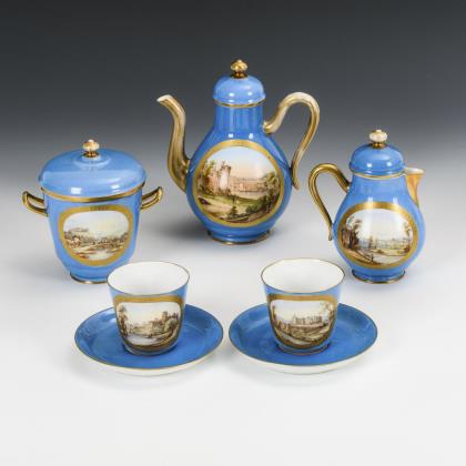7 Teile. Hellblauer Fond, in Medaillons die Darstellung verschiedener, auf dem goldgravierten Rahmen bezeichneter französischer Ansichten (u.a. Argenton-Château, Beaupréau, Clisson, Montaigu). Kaffeekanne (H 17 cm), Milchkännchen, Zuckerdose, 2 Tassen und 2 Untertassen