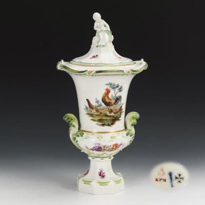 Kratervase mit Blatthandhaben, polygonalem Fuß und passend ergänztem Deckel sowie einem Putto mit Schild als Deckelknauf. Schauseitig die Darstellung einer Landschaftsinsel mit Hahn und zwei Hennen, verso ein Blumenbukett