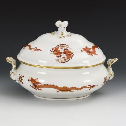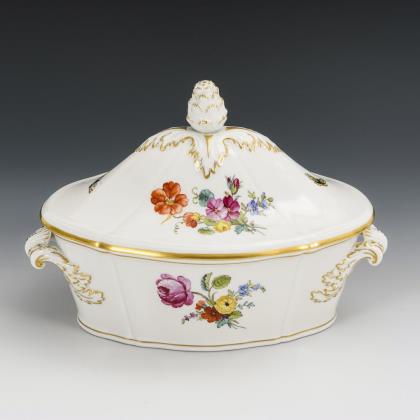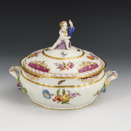 Modell "Antikzierat". Terrine mit Blütenbelag an den Henkeln und einem Putto mit Weintraube als Deckelknauf. Mit Blumen- und Insektenmalerei