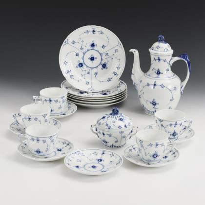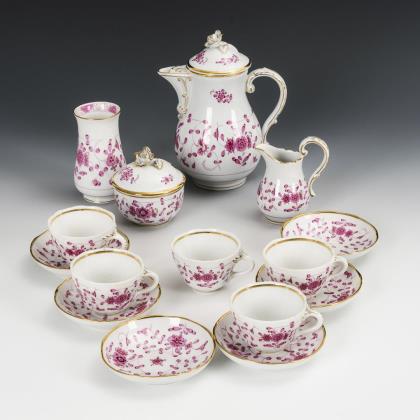 Form "Altozier". Mokkakanne (H 19,5 cm), Milchkännchen, 7 Teetassen, 7 Untertassen, 7 Kuchenteller, 1 ovales Tablett (L 36,5 cm), 1 Ovalschale (L 20 cm) und 1 Ovalplatte (L 32 cm)