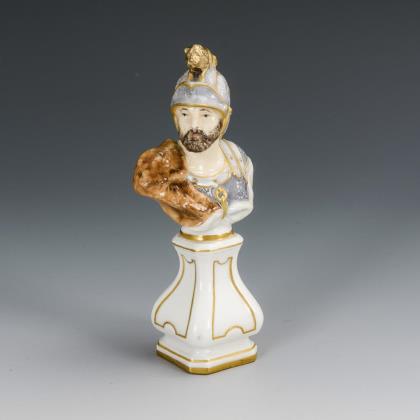 Auf einem Sockel ruhende Büste des Kriegsgottes Mars mit Löwenfell und löwenbesetztem Helm