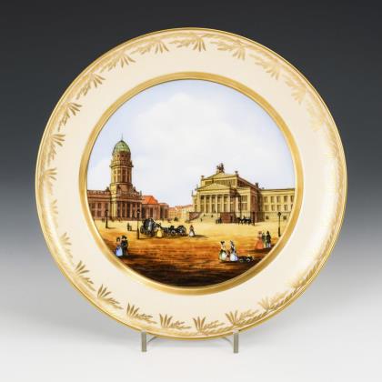 Eierschalenfarbiger Fond mit Goldbordüre. Im Spiegel die unterseitig bezeichnete Ansicht des Schauspielhauses in Berlin