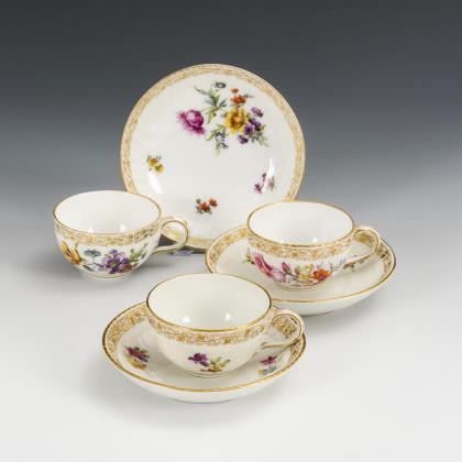 Form "Neuer Ausschnitt". 3 Teller (Ø 14 cm), 2 Mokka-Untertassen (Ø 11 cm), 1 Teetasse (H 5 cm), 1 Tasse (H 6 cm) und 1 Halbmondschale (L 25 cm)