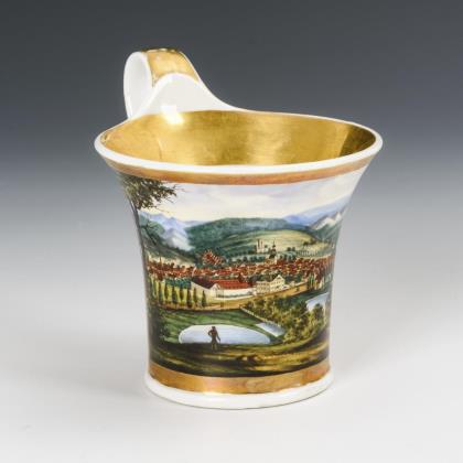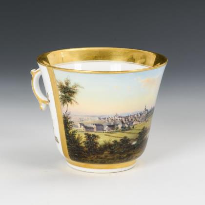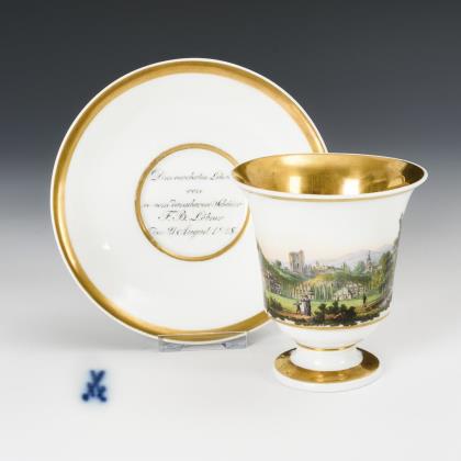Gefußte Kratertasse mit Blatthenkel. Schauseitig eine unterseitig bezeichnete Ansicht von Tharandt in Sachsen, im Spiegel der Untertasse die Widmung "Dem verehrten Lehrer von seinem dankbaren Schüler F. B. Löbner den 21. August 1828"
