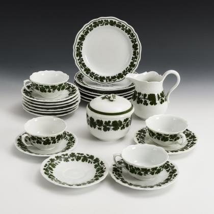 Form "Neuer Ausschnitt". 8 Suppenteller, 8 Speiseteller, 8 Vorspeisenteller, 2 Ovalplatten (L 26,5 und 30 cm), 2 Ovalschalen (L 25 und 27 cm), 1 Schüssel, 1 runde Schale, 1 Sauciere und 1 Deckelschüssel (Ø 26,5 cm)