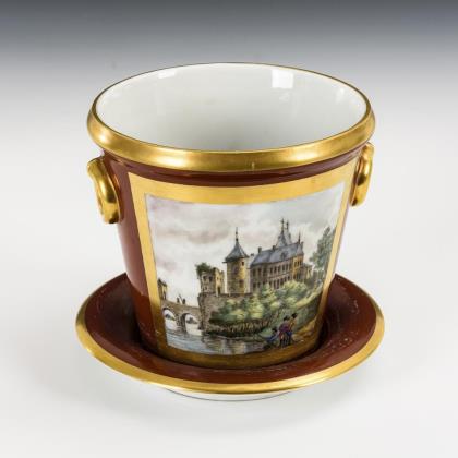 Konischer Übertopf mit zwei Ringhandhaben, braunem Fond und der gemalten Ansicht eines alten Schlosses in einer goldgerahmten Rechteckkartusche