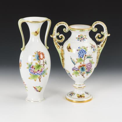 1x Balustervase mit zwei Rocaillehenkeln und Rundfuß. / 1x schlanke Balustervase mit zwei gewinkelten Henkeln