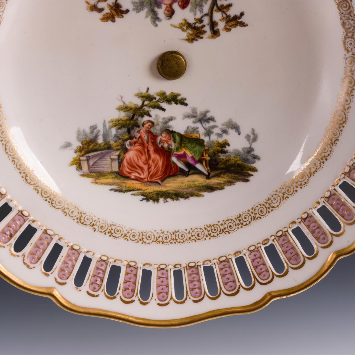 Teller in der Form "Neuer Ausschnitt" mit stabdurchbrochener Fahne, auf Rundfuß. Im Spiegel zwei kleine Parklandschaften mit einer galanten Szene. 2 Randrestaurierungen.