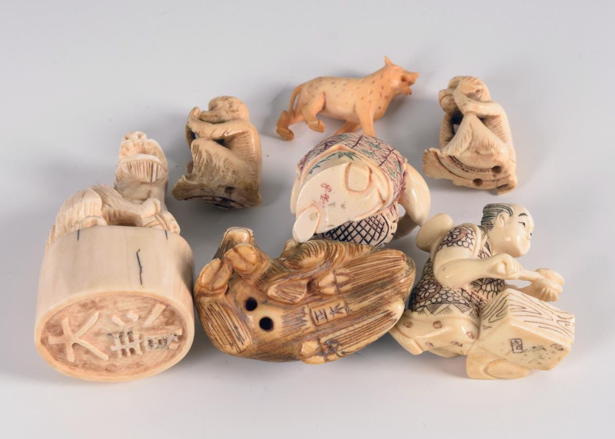 Stempel mit Fo-Hund und eingeschnittenem Schriftzeichen, Elfenbein. / 2 Netsuke: männliche Figuren, Verkäufer und Muschelöffner, beide signiert, Elfenbein. / Netsuke - zwei Schweine, signiert, wohl Bein, geklebt. / 2 Netsuke - Affe, sich die Ohren bzw. den Mund zuhaltend, wohl Bein. / Kleine Figur eines Hundes oder Schakals, wohl Bein.