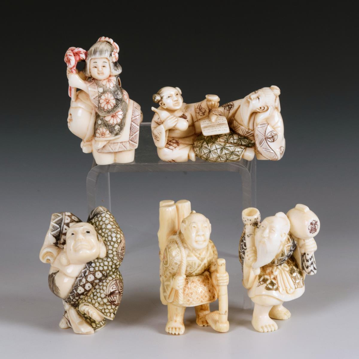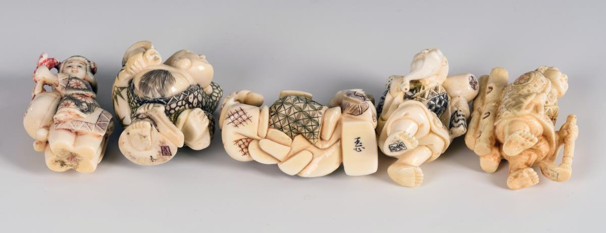 Tanzender Hotei / Bärtige Figur mit Sack, Pfeife und Trommel / Kind auf einem Fabeltier reitend / Bauer mit Hacke und Bambuslast / Figurengruppe, lesender Alter und Kind mit Kürbisflasche. Alle fein graviert, mit teils dezenter Farbigkeit.