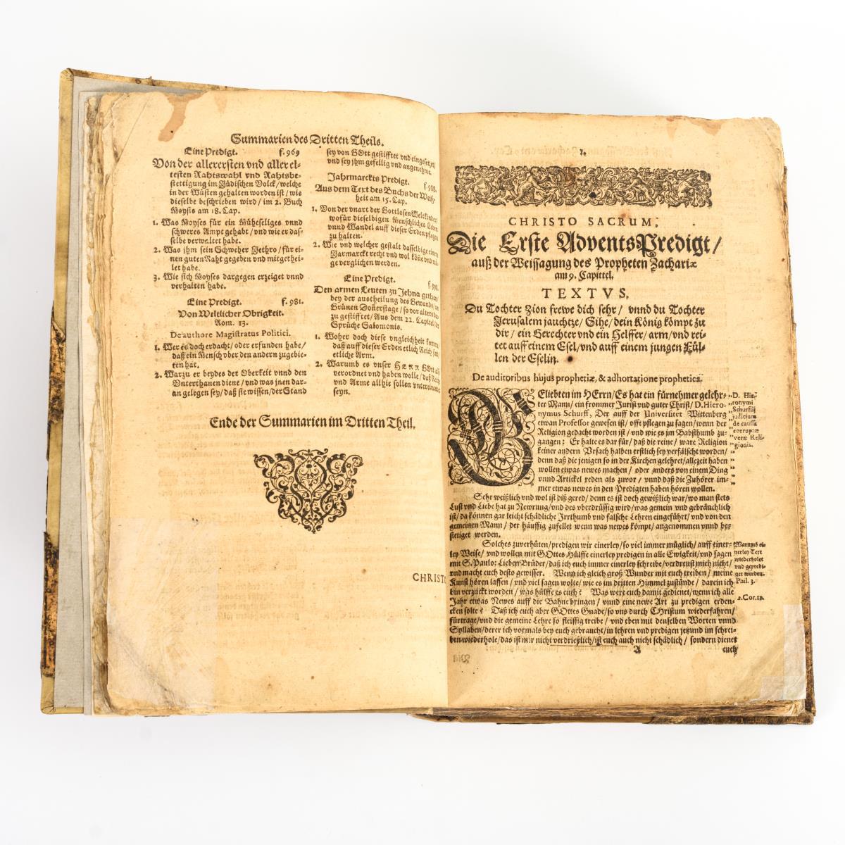 Titel und Ende fehlen. Vorhanden sind "Summarien des dritten Theils", Text beginnt mit Seite 1 "Christo Sacrum. Die Erste AdventsPredigt aus der Weissagung des Propheten Zachariam 9. Capitel". Endet u.a. mit "Christo Sacrum. Eine Predigt Den armen Leuten zu Jhena gethan, bey der Auftheilung des Gewands am Grünen Donnerstag ..." 1000 Seiten mit einigen Holzschnitten. Neu gebunden unter Verwendung des alten Einbandes. Fachmännisch restauriert.
