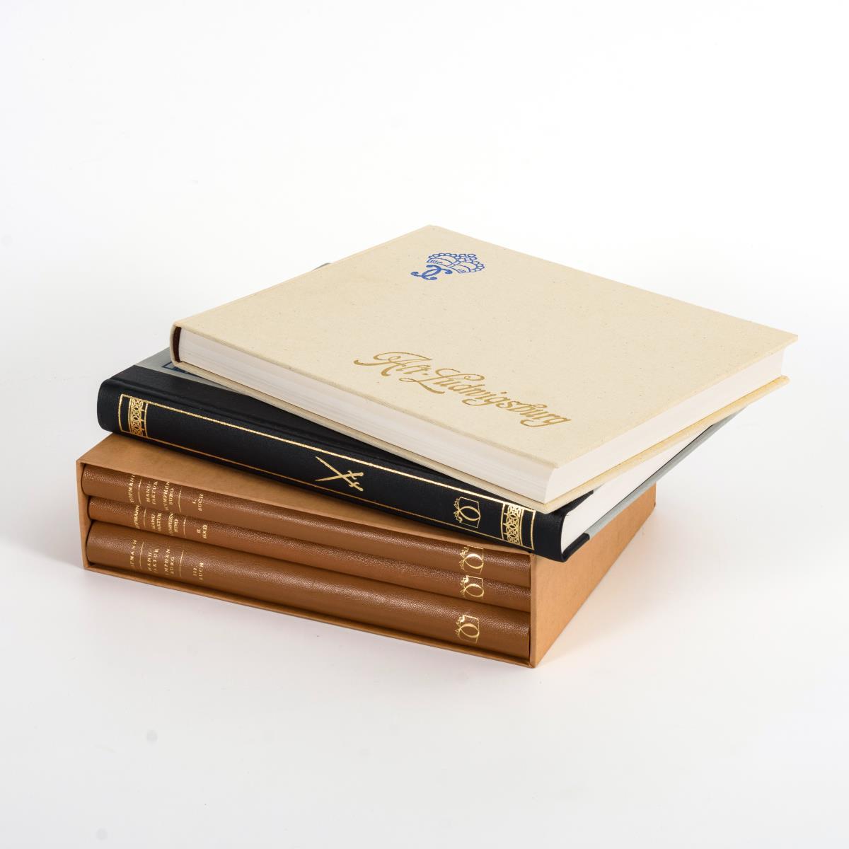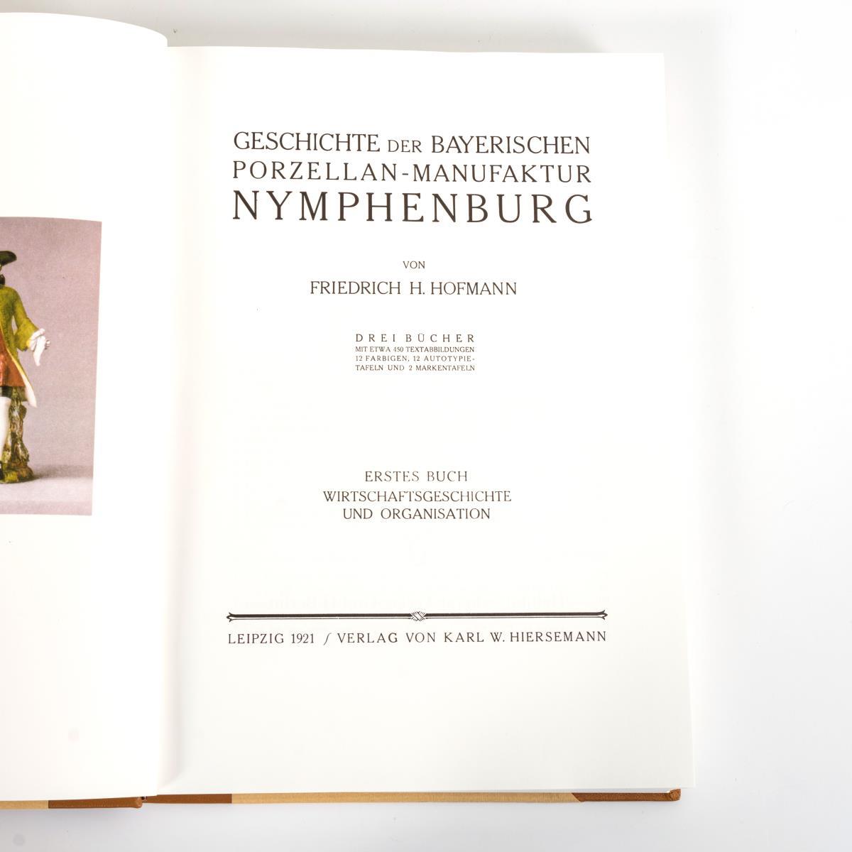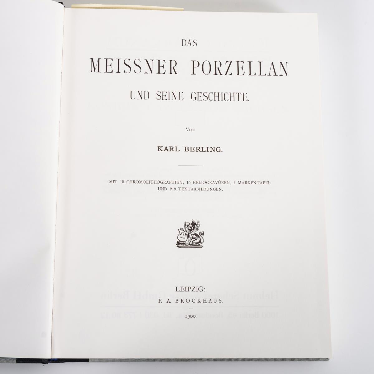 Hofmann, Friedrich H.: "Geschichte der Bayrischen Porzellan-Manufaktur Nymphenburg", 3 Bände, Leipzig 1921/1991, Verlag K.W. Hiersemann und Scherer Verlag. Auflage von 500 Exemplaren, Nr: h.c. Halbledereinbände im Schuber. / Wanner-Brandt, Otto: "Album der Erzeugnisse der ehemaligen württembergischen Manufaktur Alt-Ludwigsburg, nebst kunstgeschichtlicher Abhandlung von B. Pfeiffer", Stuttgart; Berlin 1906;1991, Auflage 500 Expl., ohne Seitenzählung, 24 x 30 cm, Leineneinband im Schuber / Berling, Karl: "Das Meissner Porzellan und seine Geschichte", Leipzig; Berlin 1900/1992, 211 Seiten, Halbledereinband, 33 x 25 cm. Neuwertig.