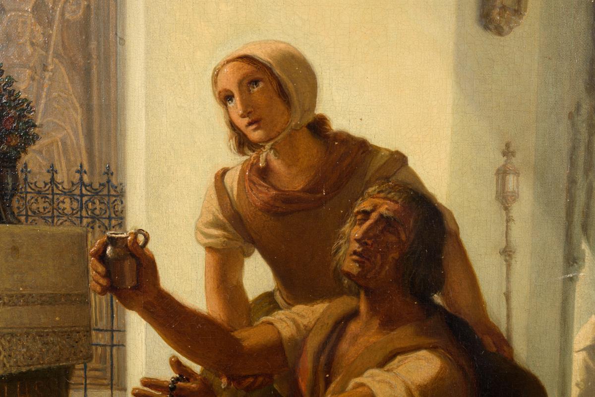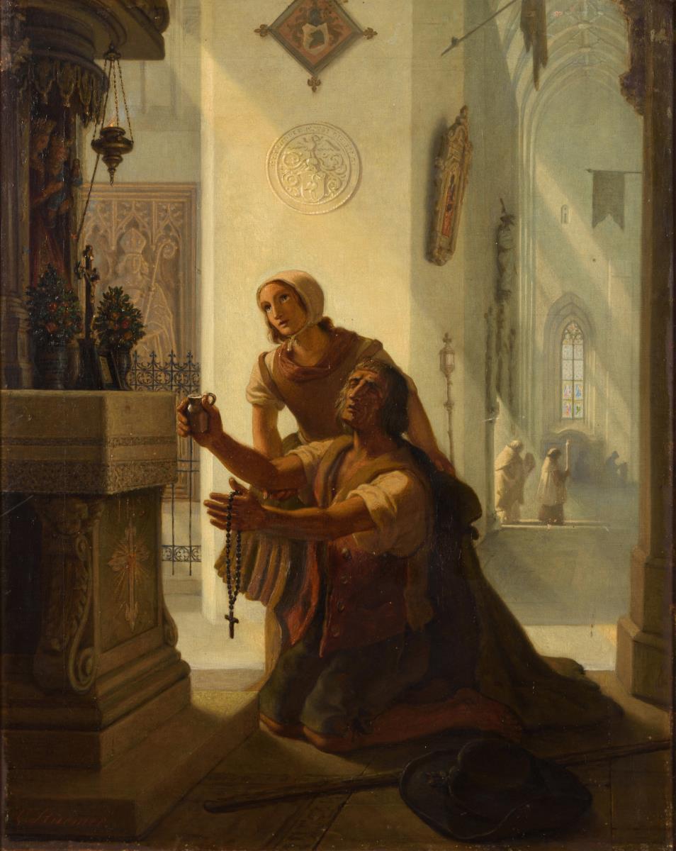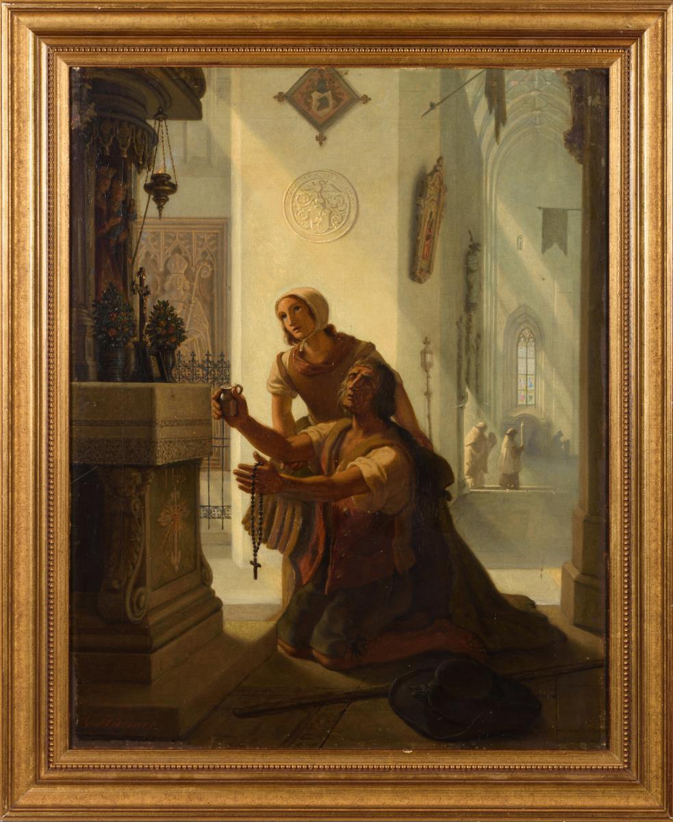 Hingebungsvoll betendes Paar vor einer Marienstatuette im Kirchenraum. Eine restaurierte Stelle mit Hinterklebung.