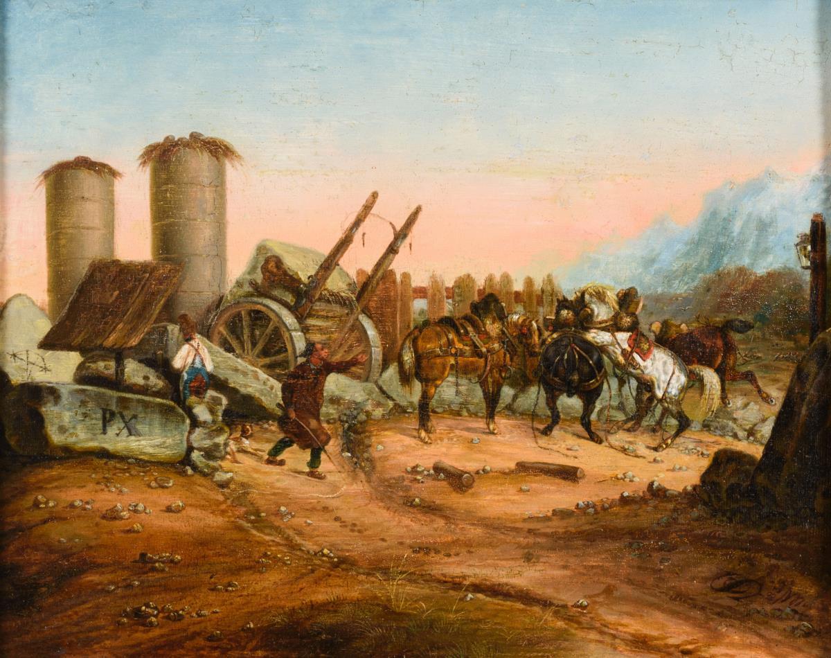 Ausbrechende Pferde am Rand des Steinbruchs beim nach hinten gekippten Karren, dem arbeitenden Steinmetzen und dem nahenden Treiber. Leichte Altersspuren.