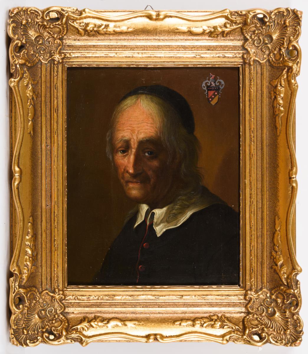 Qualitätvolles Bildnis eines jüdischen Geistlichen mit weißem Haar unter schwarzer Kippa. Retuschiert.