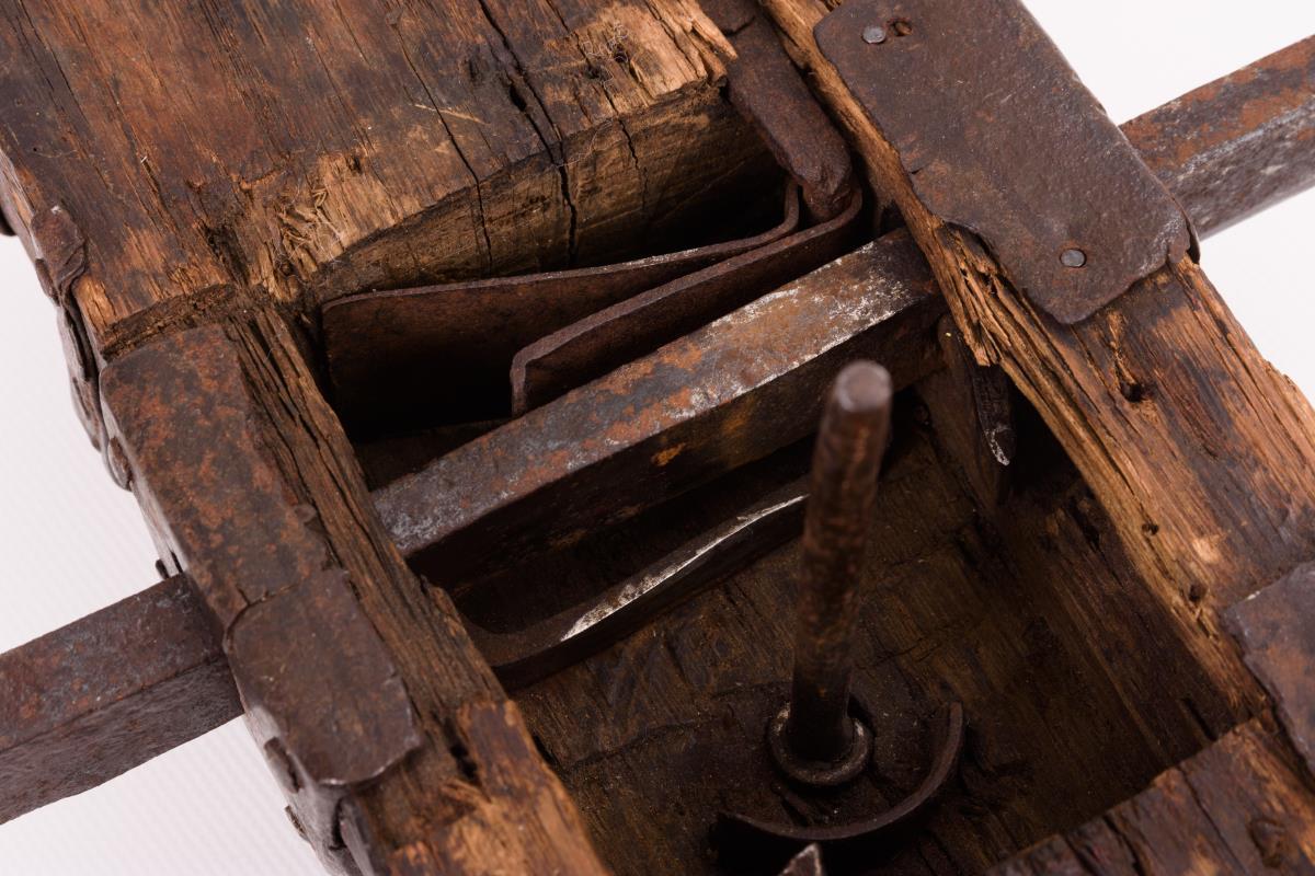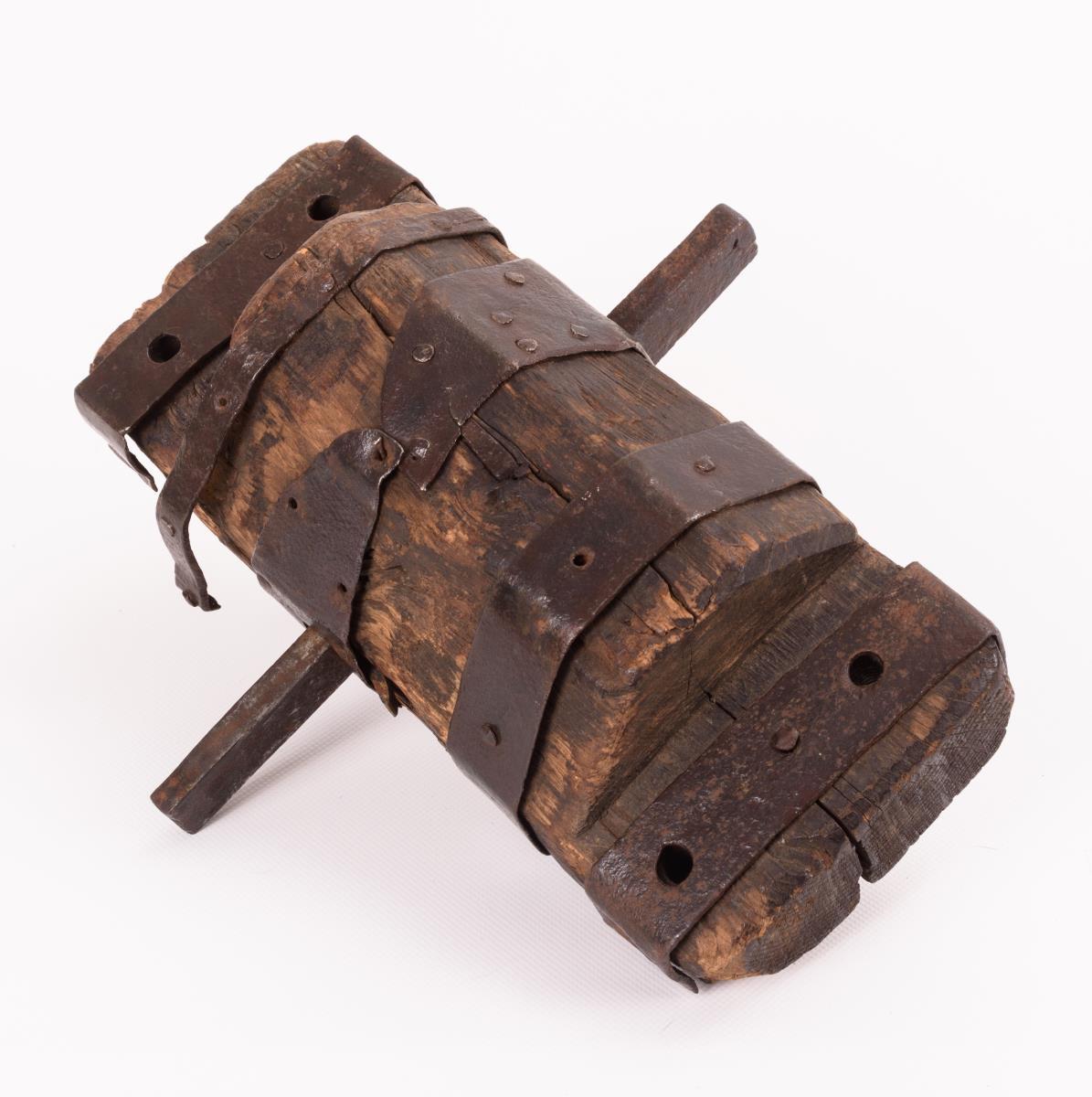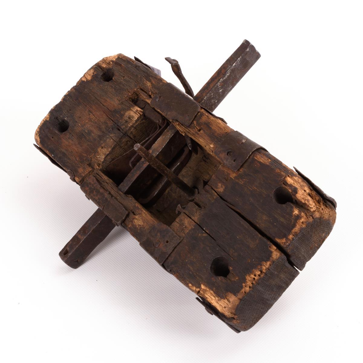 Funktionsfähiges Schloss mit langem Schlossriegel und langem Dorn für den fehlenden Hohldornschlüssel; im Inneren 1 Reifen. Außen verstärkend mit Eisenbändern beschlagen sowie 4 leicht konische Bohrlöcher zur Montage an der Tür. Trockenrisse, teils gelöste Nagelungen, Alters-/Gebrauchsspuren.